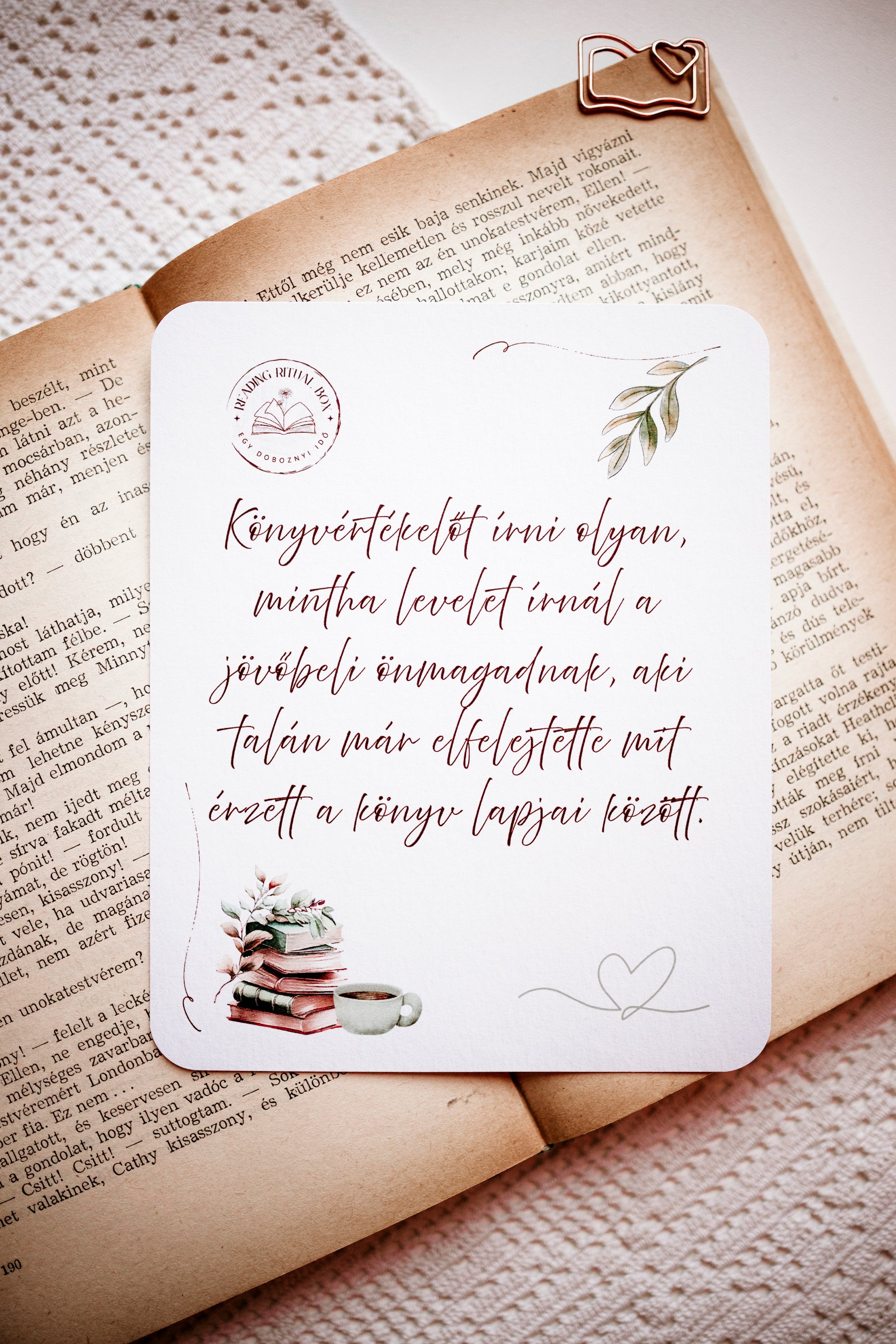 Az A5-ös méretű, írható papírra készült kártyán feljegyezheted a könyv címét, kedvenc idézetedet, értékelésedet és az érzéseidet – mintha levelet írnál a jövőbeli önmagadnak.