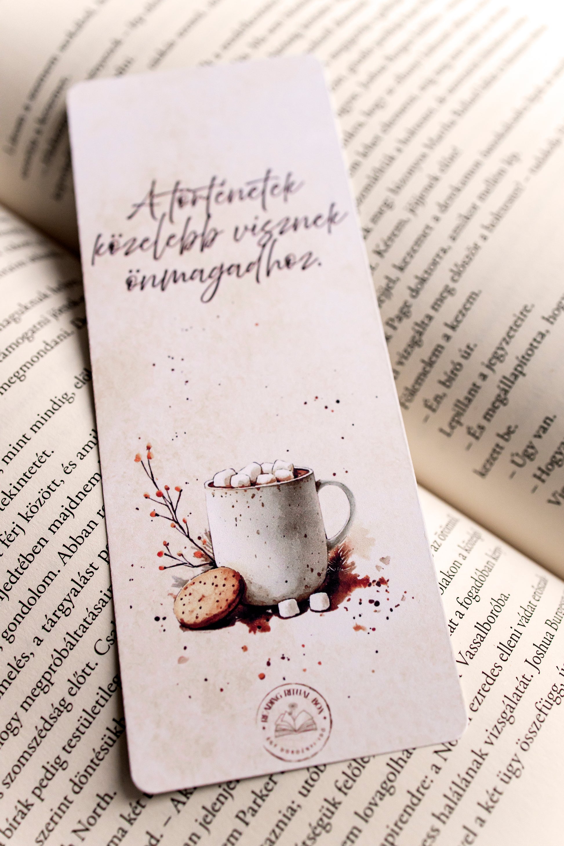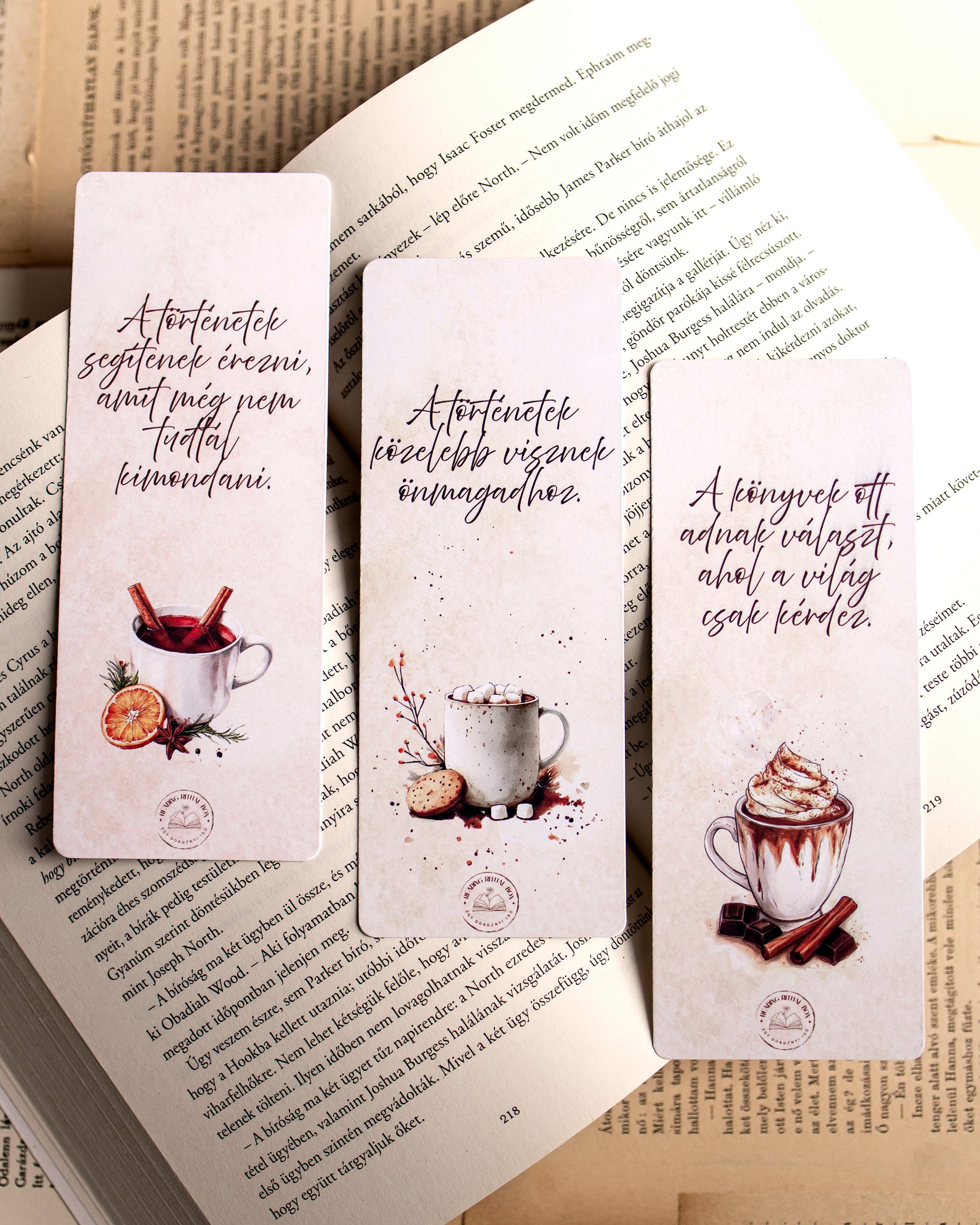 Mindhárom könyvjelző meleg tónusú, akvarell hatású illusztrációval készült, amelyek a nyugalom és az olvasás örömét közvetítik.